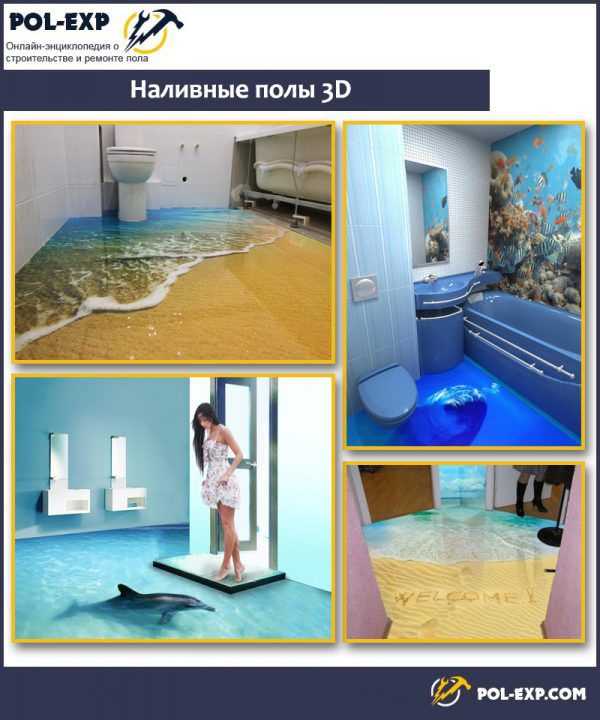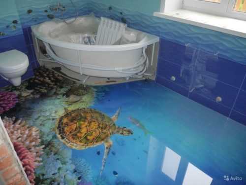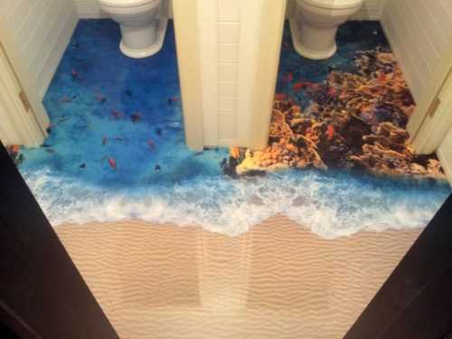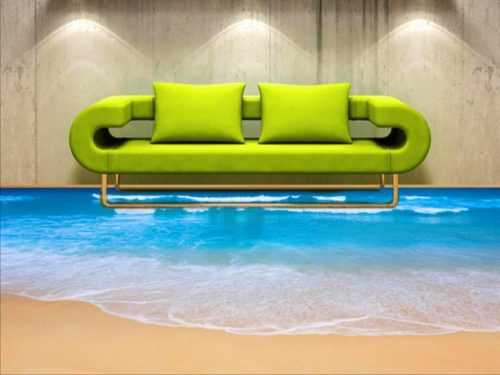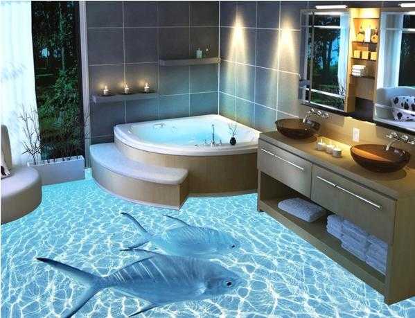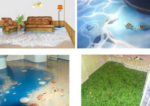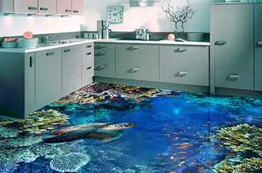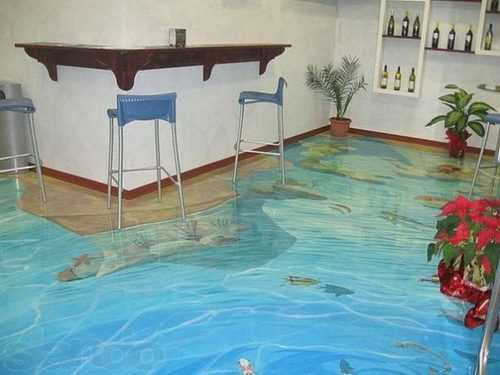 Современные технологии дают возможность создать полы с трёхмерными изображениями. Невзирая на то, что это декоративное покрытие, оно очень удобное и практичное. Кроме того, это очень необычные и оригинальные варианты напольного покрытия, которое гармонично впишется в любой интерьер. Эта технология позволяет экспериментировать. Вместо обычных рисунков можно использовать и природные материалы: высушенные листья, песок разных цветов, кристаллы, ракушки, гальку и другие материалы по желанию.