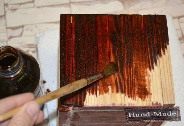 Небольшого размера деревянное изделие, можно положить в плотно закрывающуюся посуду из стекла или керамики. Туда поместить открытую емкость со смесью. Через пару часов изделие можно доставать.