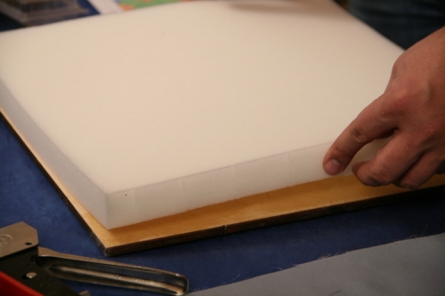 - С лицевой стороны по периметру рамы прибивают фанерные листы, после чего на получившийся каркас наклеивают синтепон;