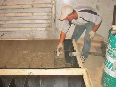 В первую очередь расставьте формы на чистой, сухой, ровной поверхности. Смажьте их водой или маслом с внутренней стороны для того, чтобы в дальнейшем готовый материал было проще извлечь. Разлейте готовую смесь по формам. Металлической планкой снимите лишний раствор сверху и по краям, выровняйте поверхность.