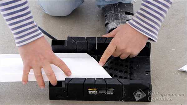 - Устанавливаем плинтус в приспособление таким образом, чтобы его расположение совпадало с положением на потолке.
