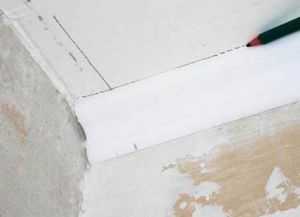 - Прикладываем плинтус к потолку и проводим линию внутреннего его края.