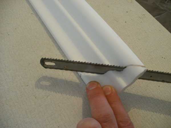 При обрезании мягких материалов (ПВХ, пенополистирола) используйте ножовку по металлу или обычный строительный нож. Тогда ваша работа будет аккуратна и с ровными краями. Для точного отрезания, необходимо начинать отрезать его с лицевой части.