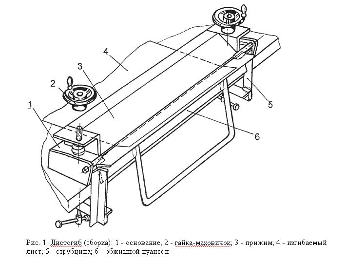 Представленные станок изготовлен из швеллеров и уголков. Уголки сварены в короб. Это рабочий узел. Прижимная планка сделана также из сваренных между собой уголков в короб. Зажим листа осуществляется с 2 сторон, на которых установлены прижимные винты. Однако, как показал опыт, достаточно ограничиться одной стороной. Между рабочими органами, в которые зажимается лист, установленны клапанные пружины для того, чтобы прижимная планка свободно поднималась, когда происходит ослабление зажима.