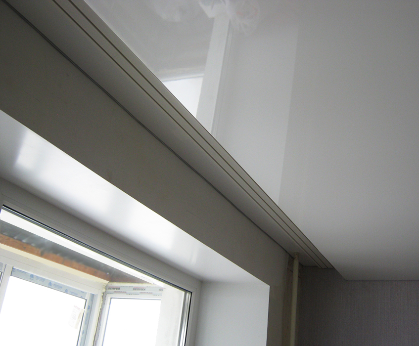 Это ещё один способ закрыть верхнюю часть ниши для штор натяжным полотном. Метод ещё более простой, так как используется багет со встроенными креплениями для портьер — гардинный профиль ПК-5.