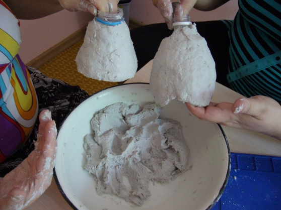 Переворачиваем ее в подходящей таре, чтобы форма не упала. И заливаем раствором гипса консистенции жидкой сметаны. Перед тем, как поставить форму с гипсом в стаканчик, помните ее слегка, чтобы гипс просочился во все места формы.
