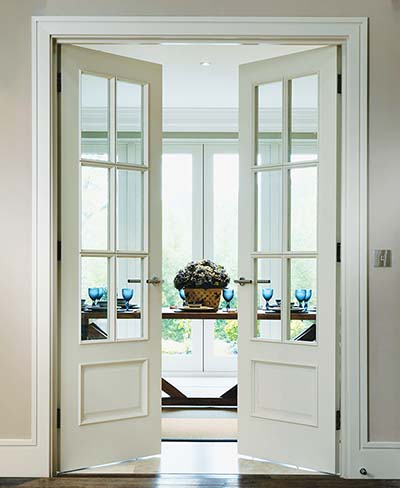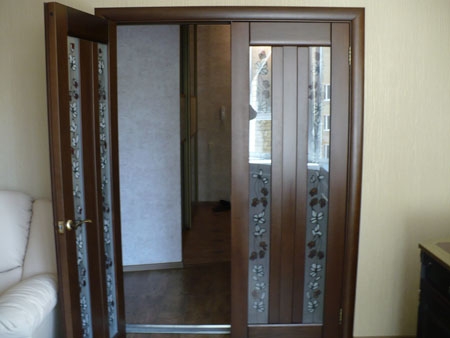 Остекленные распашные двери визуально расширяют пространство и добавляют света. Стекло может занимать почти всю площадь дверного полотна, только часть или служить фигурным декоративным элементом. Сами стекла для межкомнатных распашных дверей тоже бывает разных видов: рельефные, гладкие, матовые, прозрачные, цветные, гравированные, витражные, зеркальные. Распашные стеклянные двери менее прочные и небезопасные.
