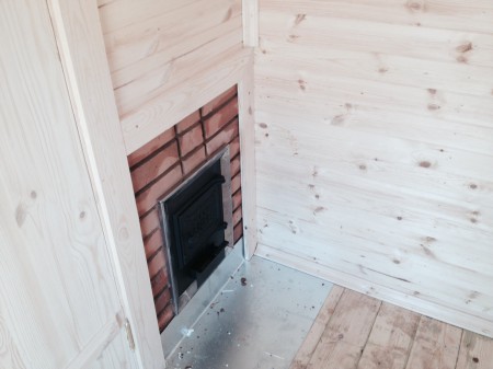 - Заложите кирпичом пространство между топкой и стеной. Оштукатурьте кладку с обеих сторон или обшейте ее листовым железом. При обустройстве выносной топки внутри бани накройте пол листом оцинкованного железа.