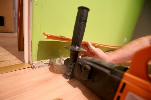 Смотрю и очищаю все углы, внутренние и наружные, чтобы не было мусора и других помех, места установки заглушки тоже очищаю. Различные неровности на стене, где будет устанавливаться плинтус, удаляю с помощью молотка и стамески.