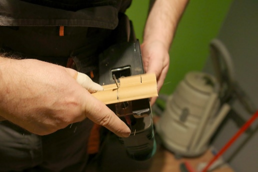 Перед первым чистовым распилом по отметке, попробуйте распилить плинтус на его ненужном участке.