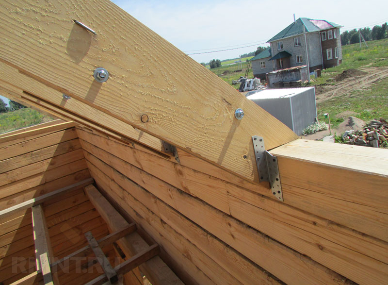 Стропила крепятся к поясу механическим способом (причем часто в ноге вырезается небольшой угол, высотой не более 50 мм, для более жесткой опоры).